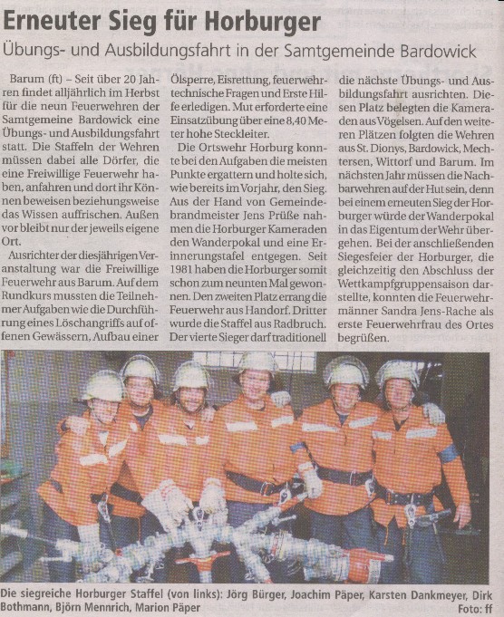 Sie holte wie in den vergangenen Jahren bei dem Vergleich die meisten Punkte. In der Rangliste folgten: Handorf,Radbruch, Vögelsen, Wittorf, Mechtersen, Barum, Bardowick und St.Dionys. Mit dem diesjährigen Sieg der Horburger Wehr ging der gewonnene Wanderpokal endgültig in ihren Besitz über.